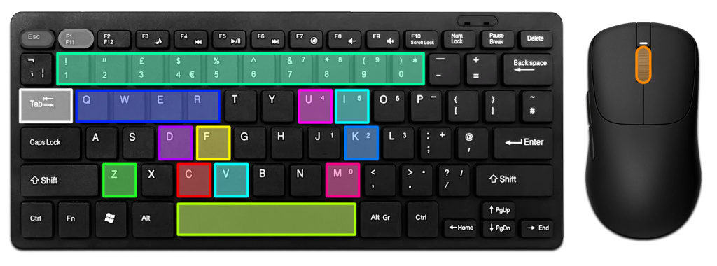 • 1, 2, 3, 4, 5, 6, 7, 8, 9, 0 – Atalhos configuráveis para habilidades
